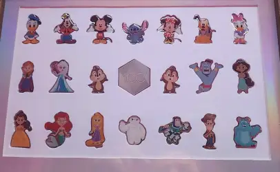 Pin features Ariel , Belle , Chip and Dale , Elsa , Daisy Duck , Sulley , Donald Duck , Goofy , Jasmine , Mickey Mouse , Minnie Mouse , Pluto , Rapunzel , Woody , Buzz Lightyear , Stitch , Baymax , Genie and Anna from Lilo and Stitch , Tangled , Beauty and the Beast , Frozen , The Little Mermaid , Aladdin (movie) , Monsters Inc. , Toy Story and Big Hero 6