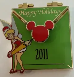 Tinkerbell is a Limited Edition (LE) 1500 pin from the Happy holidays 2011 Hinged envelopes pin series. It was originally released in January, 2011 and was available from Multiple Sources (WDW, DLR, etc.).