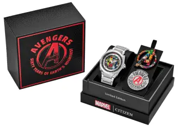 Marvel’s Avengers: Beyond Earth’s Mightiest watch and 2-pin set is a Limited Release 2-pin set from the Citizen Watch pin series. It was originally released on , 2023 and was available from an Officially Licensed Disney trading pin vendor (see description for more information).