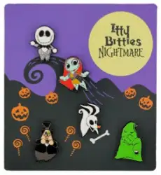 Full Set is an Open Edition 5-pin set from the Itty Bitties Nightmare Before Christmas Booster Set pin series. It was originally released on , 2014 and was available from Multiple Sources (WDW, DLR, etc.).