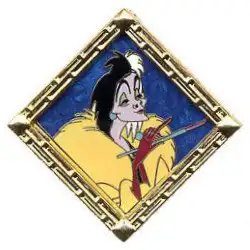 Cruella de Vil is a Limited Edition (LE) 750 pin from the Villain Portrait pin series. It was originally released on , 2005 and was available from Multiple Sources (WDW, DLR, etc.).