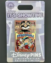 Pinocchio - The Great Stromboli Puppet Show is a Limited Edition (LE) 3000 pin from the It’s Showtime Poster Series pin series. It was originally released on , 2024 and was available from Multiple Sources (WDW, DLR, etc.).