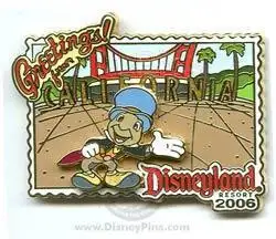 Sunshine Plaza Golden Gate Bridge - Jiminy Cricket is a Limited Edition (LE) 1000 pin from the Greetings from Disneyland Postcards 2006 Collection pin series. It was originally released on , 2006 and was available from Disneyland Resort .