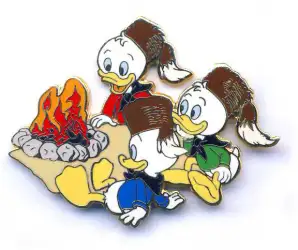 Junior Woodchucks Huey, Duwey and Louie sitting at a Campfire is a Limited Edition (LE) 2500 pin from the Mickey's all american pin quest pin series. It was originally released in August, 2007 and was available from Disneyland Resort .