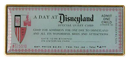 A Day at Disneyland - Child Ticket Only is a Limited Edition (LE) 1955 pin in the Press Kit Starter Set 7-pin set from the Dateline: Disneyland 1955 pin series. It was originally released on , 2010 and was available from Disneyland Resort .
