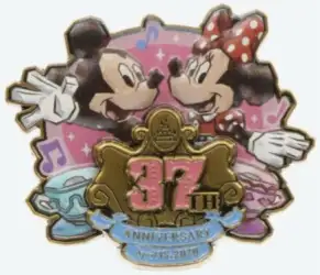 37th Anniversary - Mickey and Minnie with Teacups and Logo is a Limited Release pin from the Tokyo Disneyland Anniversaries pin series. It was originally released in September, 2020 and was available from Tokyo Disneyland Resort .