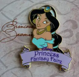 Jasmine is an Open Edition pin in the Princess Fantasy Faire pin set 5-pin set from the Princess Fantasy Faire pin series. It was originally released on , 2008 and was available from Disneyland Resort .