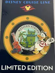 Donald Western Europe is a Limited Edition (LE) 150 pin from the Disney Cruise Line Destinations: Western Europe pin series. It was originally released on , 2020 and was available from Disney Cruise Line .