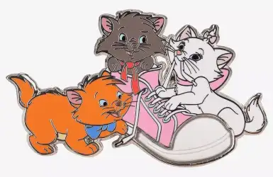 Kittens playing with shoe is an Open Edition pin from the BoxLunch - Disney pin series. It was originally released on , 2024 and was available from an Officially Licensed Disney trading pin vendor (see description for more information).