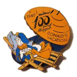 "Donald's Vacation" starring Donald Duck is a Limited Edition (LE) 3000 pin from the Mickey & Pals - 100 Years of Magic pin series. It was originally released on , 2001 and was available from an Officially Licensed Disney trading pin vendor (see description for more information).