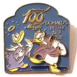 "Donald's Better Self" starring Donald Duck is a Limited Edition (LE) 2600 pin from the Mickey & Pals - 100 Years of Magic pin series. It was originally released on , 2001 and was available from an Officially Licensed Disney trading pin vendor (see description for more information).