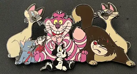 Pin features The Cheshire Cat , Figaro , Lucifer , Si and Am and Berlioz from Alice in Wonderland (movie) , Cinderella (movie) , The Aristocats , Lady and the Tramp and Pinocchio (movie)