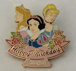 Aurora, Snow White, and Cinderella is an Open Edition pin from the Happy Birthday pin series. It was originally released on , 2001 and was available from Disneyland Resort .