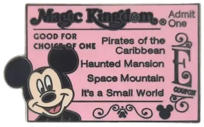 "E" Coupon is an Open Edition pin from the WDW Hidden Mickey Series 2007: Magic Kingdom Tickets pin series. It was originally released on , 2006 and was available from Walt Disney World .