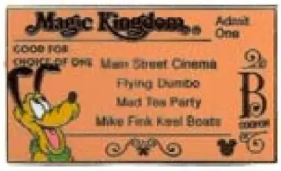 "B" Coupon is an Open Edition pin from the WDW Hidden Mickey Series 2007: Magic Kingdom Tickets pin series. It was originally released on , 2006 and was available from Walt Disney World .