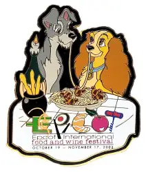 Lady and the Tramp is a Limited Edition (LE) 3500 pin from the EPCOT International Food & Wine Festival 2002 pin series. It was originally released on , 2002 and was available from Walt Disney World .