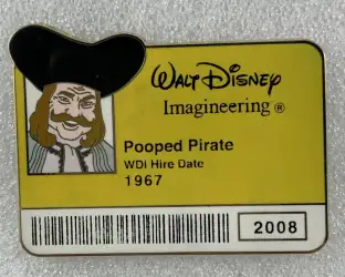 Pooped Pirate ID Badge is a Limited Edition (LE) 300 pin from the I.D. Badge Series 2 pin series. It was originally released on , 2008 and was available from Walt Disney Imagineering .