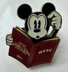 Mickey Reading Menu is a Limited Edition (LE) 400 pin in the Festival Boxed Set 4-pin set from the EPCOT International Food & Wine Festival 2011 pin series. It was originally released on , 2011 and was available from Walt Disney World .