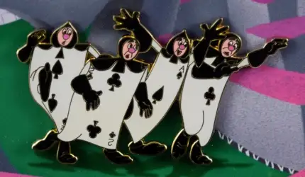 Black Cards is a Limited Edition (LE) 200 pin in the Queen of Hearts Maze Framed Pin Set 7-pin set from the Alice In Wonderland 65th Anniversary pin series. It was originally released on , 2016 and was available from Multiple Sources (WDW, DLR, etc.).