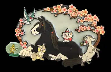 Cherry Blossoms and Friends is a pin from the Fantasy Pin Series pin series. It is an Unlicensed (Fantasy) pin, so therefore it is not allowed to be traded in the Disney Parks.