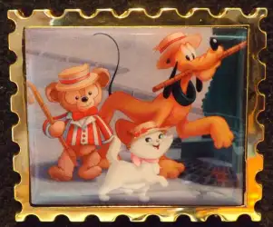 Pluto , Duffy & Marie is an Open Edition pin from the Paris Stamp Starter Set pin series. It was originally released on , 2013 and was available from Disneyland Resort Paris .