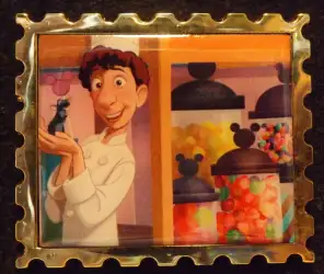 Linguini & Remy is an Open Edition pin from the Paris Stamp Starter Set pin series. It was originally released on , 2013 and was available from Disneyland Resort Paris .