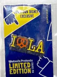 “I Heart LA” Pretzel is a Limited Edition (LE) pin from the Wetzel's Pretzels Downtown Disney Exclusive pin series. It was originally released on , 2020 and is technically a Miscellaneous Non-Disney pin, so while being considered affiliated with Disney, it is not allowed to be traded in the Disney Parks.