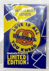 “Love is All You Knead” Pretzel is a Limited Edition (LE) pin from the Wetzel's Pretzels Downtown Disney Exclusive pin series. It was originally released on , 2020 and is technically a Miscellaneous Non-Disney pin, so while being considered affiliated with Disney, it is not allowed to be traded in the Disney Parks.