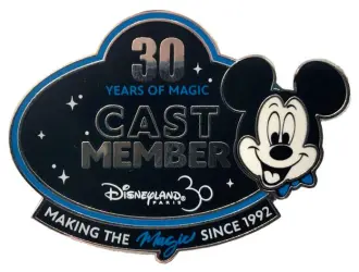 30 Years of Magic - Cast Member is an Open Edition pin from the Cast Member - Disneyland Paris pin series. It was originally released on , 2022 and was available from Theme Park Cast Member Exclusive .