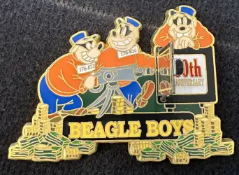 Beagle Boys 50th is a Limited Edition (LE) 3000 pin from the Character Anniversaries pin series. It was originally released on , 2001 and was available from Multiple Sources (WDW, DLR, etc.).