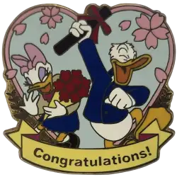 Donald and Daisy (Congratulations!) is a Limited Edition (LE) 500 pin from the Cherry Blossom Graduation Set pin series. It was originally released in January, 2009 and was available from Disney Store Japan .