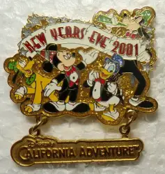 Mickey and Friends California Adventure Glitter Dangle is a Limited Edition (LE) 2001 pin from the New Year's Eve/Day pin series. It was originally released on , 2001 and was available from Disneyland Resort .