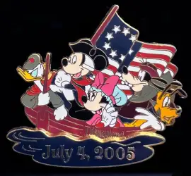 Mickey, Minnie, Donald, Pluto and Goofy Crossing the Delaware is a Limited Edition (LE) 1000 pin from the 4th of July/Independence Day pin series. It was originally released on , 2005 and was available from Disneyland Resort .