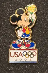 Mickey on Winners Podium is an Open Edition pin from the Olympics 2004 - USA Olympic Logo pin series. It was originally released on , 2004 and was available from Multiple Sources (WDW, DLR, etc.).