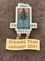 Disney’s Grand Californian Hotel & Spa “Opening Team, January 2001” Dangle is a pin from the Disneyland Resort Dangles pin series. It was available from Disneyland Resort .