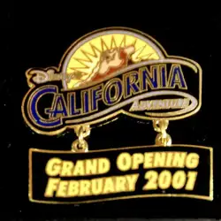 Disney California Adventure “Grand Opening, February 2001” Dangle is a pin from the Disneyland Resort Dangles pin series. It was available from Disneyland Resort .