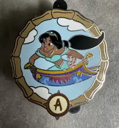 Jasmine on Magic Carpets of Aladdin is an Open Edition pin from the Adventureland Bamboo Frames Mystery Collection pin series. It was originally released on , 2024 and was available from Walt Disney World .