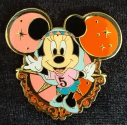 5th Anniversary - Mickey Icon - Arabian Minnie is an Open Edition pin from the Tokyo DisneySea Abu's Bazaar Game Prizes pin series. It was originally released on , 2006 and was available from Tokyo Disneyland Resort .