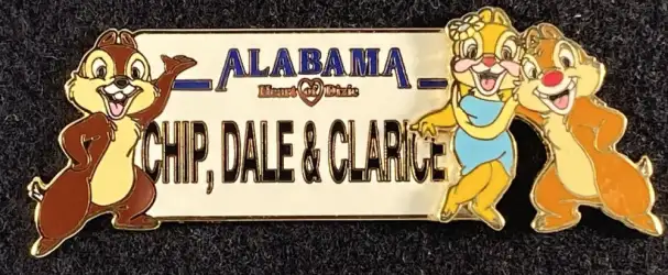 Alabama - Chip, Dale, Clarice is a Limited Edition (LE) 2000 pin from the Across America License Plate Series pin series. It was originally released on , 2003 and was available from Disney Store Japan .
