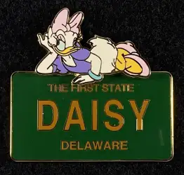 Delaware - Daisy - The First State is a Limited Edition (LE) 2000 pin from the Across America License Plate Series pin series. It was originally released on , 2003 and was available from Disney Store Japan .
