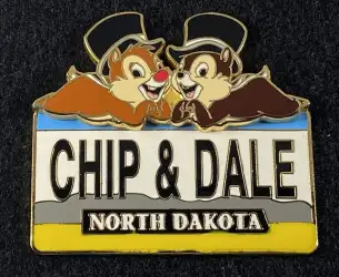 North Dakota - Chip & Dale is a Limited Edition (LE) 2000 pin from the Across America License Plate Series pin series. It was originally released on , 2003 and was available from Disney Store Japan .