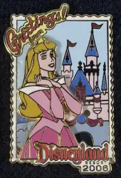 Sleeping Beauty Castle - Aurora is a Limited Edition (LE) 1000 pin from the Greetings from Disneyland Postcards 2006 Collection pin series. It was originally released on , 2006 and was available from Disneyland Resort .