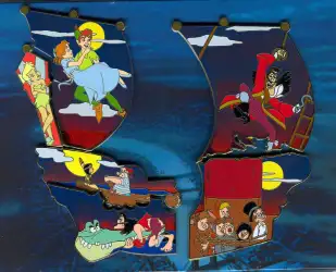 Pin features Captain Hook , Tick-Tock the Crocodile , Tiger Lily , Tinker Bell , Peter Pan , The Lost Boys , Mr. Smee , Wendy and John from Peter Pan (movie)