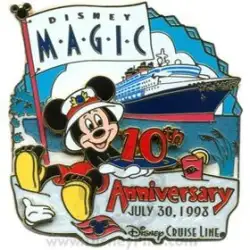 Disney Magic 10th Anniversary is a Limited Edition (LE) 500 pin from the Disney Cruise Line 10th Anniversary pin series. It was originally released in January, 2008 and was available from Disney Cruise Line .