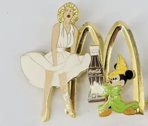 1990s European Bootleg Marilyn Monroe, Sorcerer Mickey, Coca-Cola, McDonalds is an Open Edition pin from the European Bootleg pin series. It was originally released on , 1990 and is an Unlicensed (Fantasy) pin, so therefore it is not allowed to be traded in the Disney Parks.