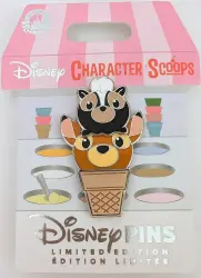Bambi and Flower is a Limited Edition (LE) 4000 pin from the Character Scoops Series pin series. It was originally released on , 2024 and was available from Multiple Sources (WDW, DLR, etc.).