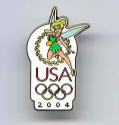 Tinker Bell with Gold Medal is an Open Edition pin from the Olympics 2004 - USA Olympic Logo pin series. It was originally released on , 2004 and was available from Multiple Sources (WDW, DLR, etc.).