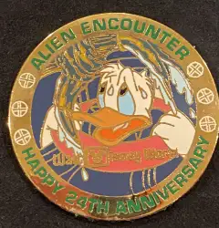Donald in Alien Encounter (Happy 24th) is a Limited Edition (LE) 1000 pin from the Company D - Walt Disney World 25th Anniversary Commemorative Framed Set pin series. It was originally released on , 1996 and was available from Theme Park Cast Member Exclusive .