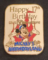 Mickey's Birthdayland (Happy 17th Birthday) is a pin from the Company D - Walt Disney World 25th Anniversary Commemorative Framed Set pin series. It was originally released on , 1996 and was available from Theme Park Cast Member Exclusive .