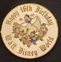 Snow White (Happy 16th Birthday) is a Limited Edition (LE) 1000 pin from the Company D - Walt Disney World 25th Anniversary Commemorative Framed Set pin series. It was originally released on , 1996 and was available from Theme Park Cast Member Exclusive .